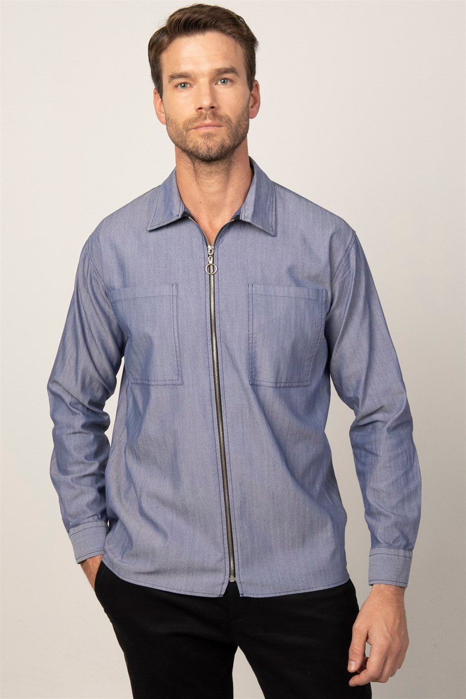 Relax Fit Denim Parça Boyalı Çift Cep Fermuarlı Erkek Mavi Gömlek (RF220031-950)