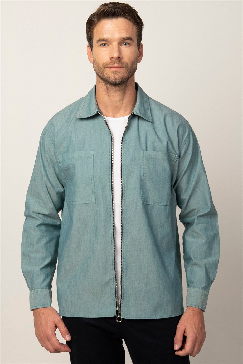 Relax Fit Denim Parça Boyalı Çift Cep Fermuarlı Erkek Turkuaz Gömlek (RF220031-951)